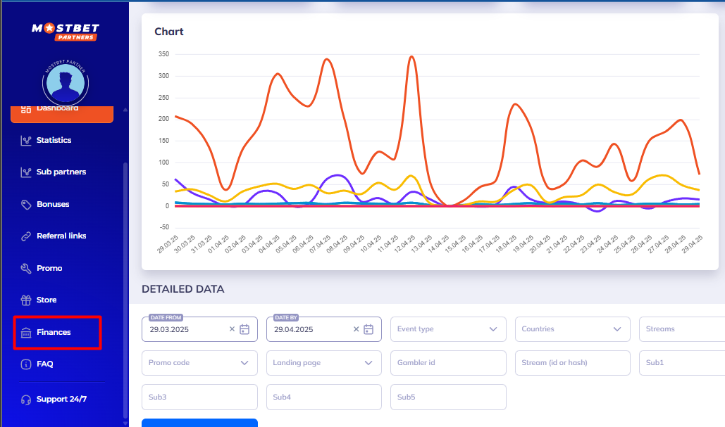 - Log in to your Mostbet Partner account and go to the “Finance” section.