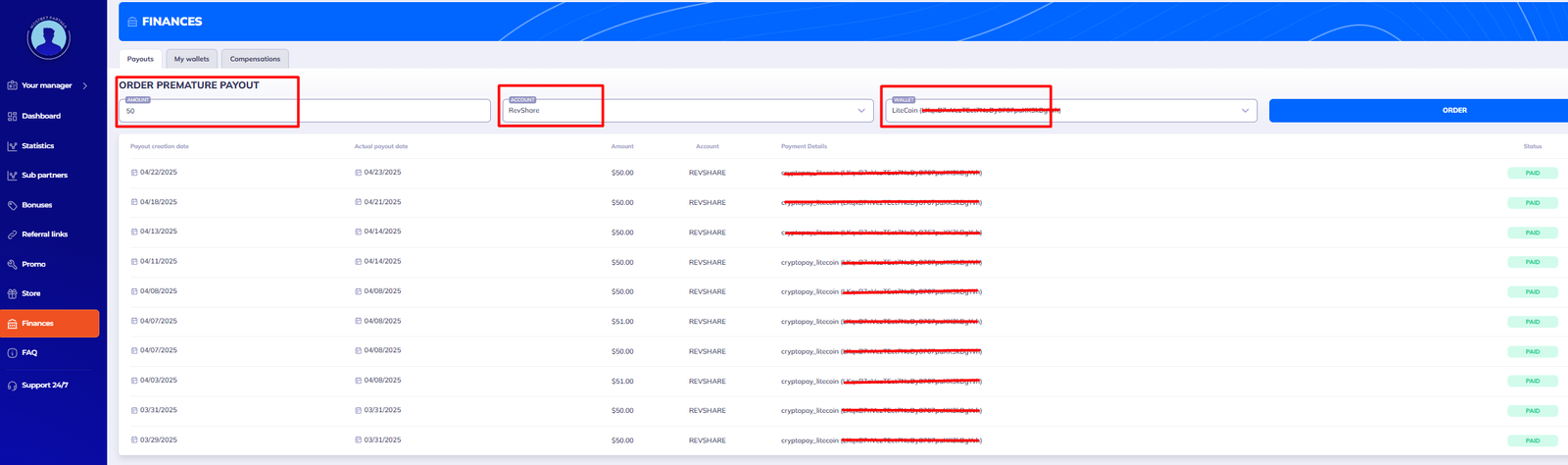 - Order: Once you fill out 3 details ( amount, account & wallet), then click ORDER to send your request to the Manager.
